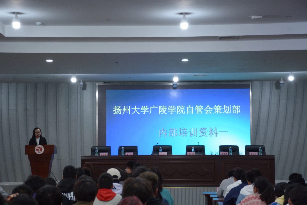 为增进新生对自管会的了解并保障自管会工作高效推进,我院于2020年11月11日星期三下午4点开展新一届的自管会全员大会,此次出席嘉宾有扬州大学广陵学院学工处副处长赵娜,扬州大学广陵学院后保处副处长帖容,学生公寓自我管理会各部门成员。