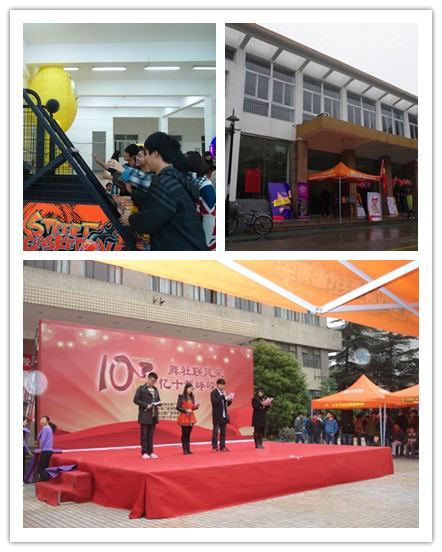 从上午10点到下午5点,路北校区大学生活动中心人声鼎沸。“音乐弹球”、“舞蹈教学”、“摄影展”,各社团纷纷出奇制胜,多种多样的趣味游戏吸引了大家的强势围观。其中,A部落篮球社的两台投篮机深受大家欢迎,不少篮球爱好者参与其中,用球技“一决高下”。此外,社联宣传部的“露天KTV”活动也是人气颇高,《十年》、《洋葱》、《我的歌声里》……同学们将一首首经典曲目演绎得十分出彩,现场的气氛也十分热烈。下午三点左右,一场别开生面的露天晚会在校园内激情上演。伴随着《江南style》的火热开场,社联各部门的同学们纷纷大显神通,一个个精心编排的节目,让在场同学大饱眼福、赞不绝口。