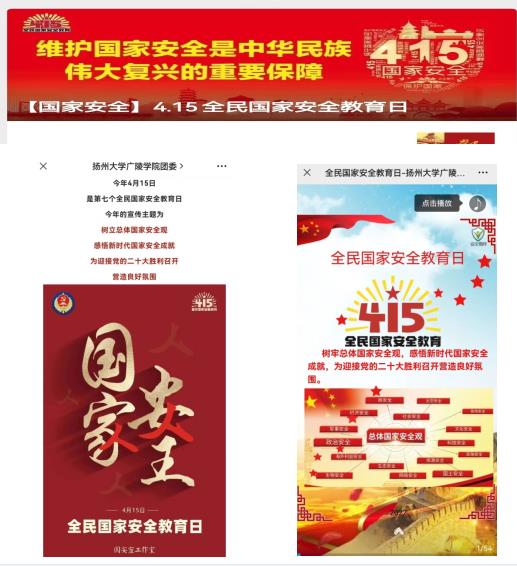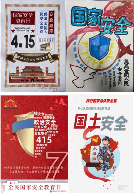 学院把握国家安全教育日契机,灵活运用线上线下资源,组织学生开展内容丰富、形式多样的国家安全宣传教育活动。组织学生错峰收看“千万师生同上一堂国家安全教育课”“国开大讲堂•国家安全教育公开课”线上公开课。院总体国家安全观课题组录制《“疫”中的人民安全观》《筑牢网络安全基石,成就网络强国梦想》《与时俱进拥抱科技 树立科技安全观》等网络课程进线上课堂。线下,各系组织学生参加邗江区“415”全民国家教育教育日网络专项答题,组织学生开展国家安全教育海报设计、横幅签字等活动。