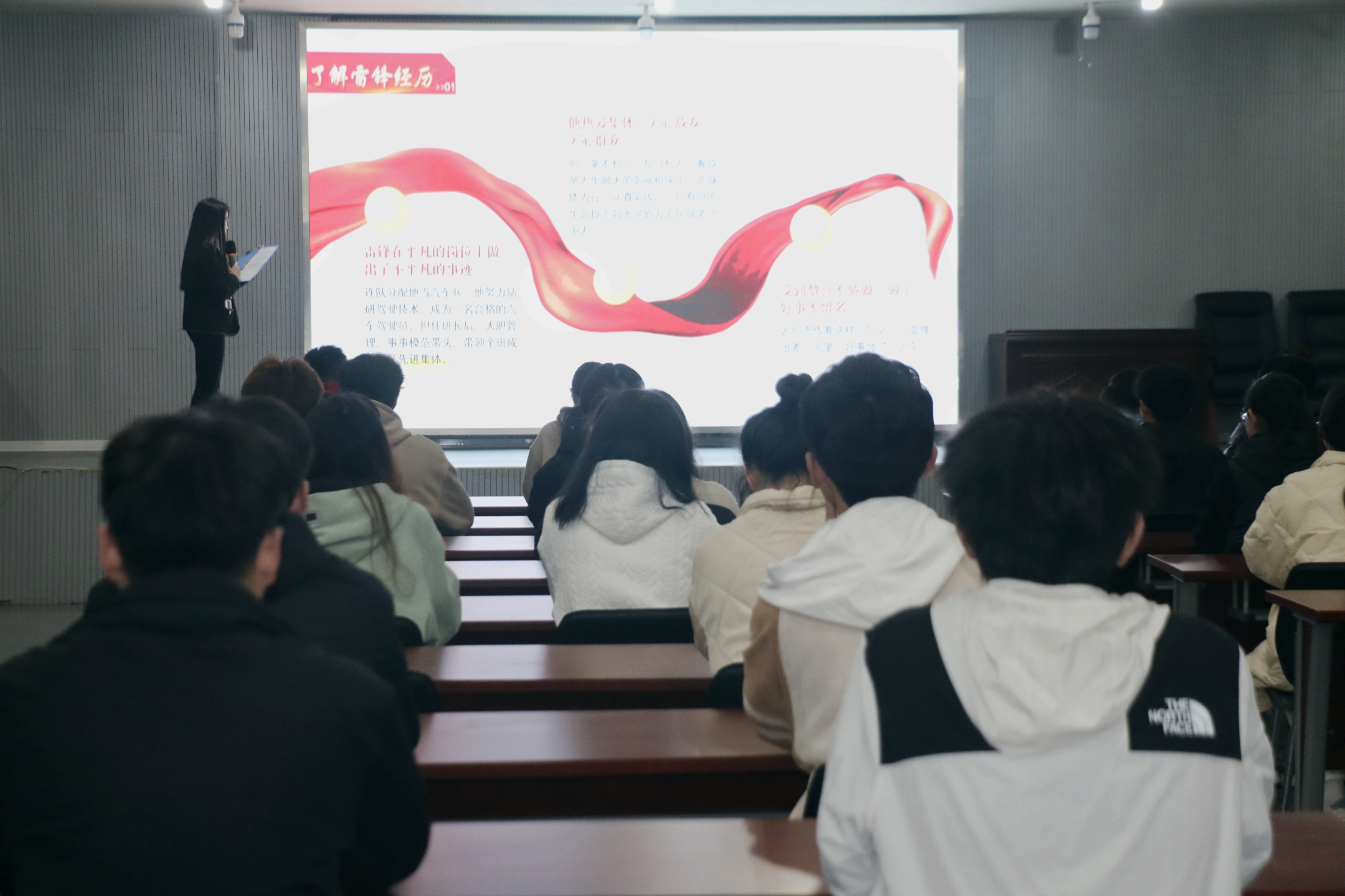 首先,在院社联负责人的主持下本次讲座徐徐拉开帷幕,并由宣讲人讲述雷锋同志生平经历及故事,通过宣讲人的详细讲解,同学们了解到雷锋同志不仅是中国人民解放军的模范战士,更是社会主义时代的光荣标兵。随后由宣讲人为同学们阐述雷锋精神的内容及时代内涵。雷锋精神是中国共产党人理想信念、价值理念和道德观念的具体体现。无数的实践充分证明雷锋精神过去是、现在是,将来仍然是我们宝贵的精神财富。紧接着分别由来自阳光协会负责人和青年志愿者协会负责人分享践行雷锋精神的感想。他们承诺志愿服务类社团将秉持“弘扬雷锋精神,争做新时代青年”的理念,将雷锋的奉献精神、钉子精神融入日常,落实到生活当中,以雷锋为榜样,积极参与志愿服务,用行动诠释何为“雷锋精神”。