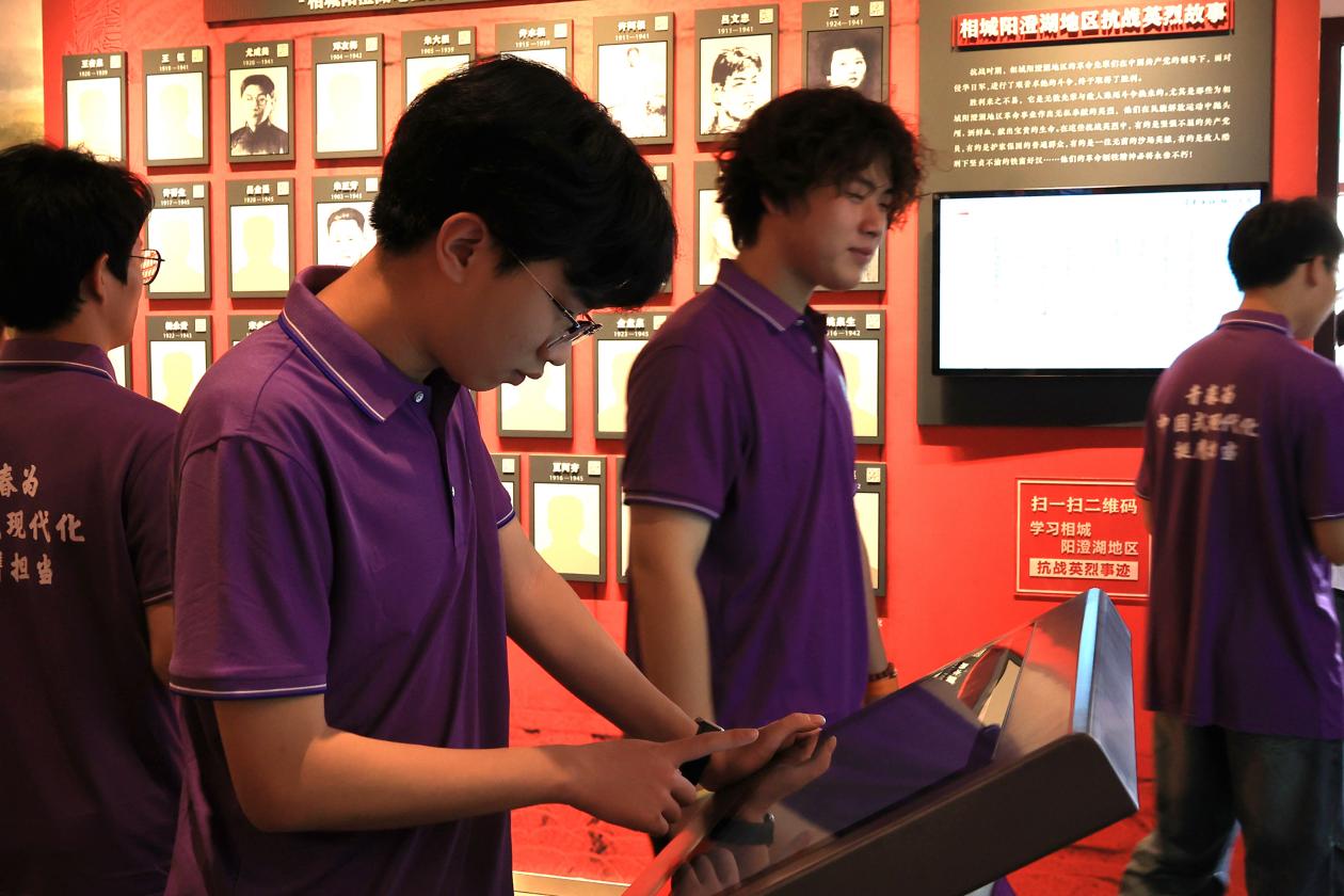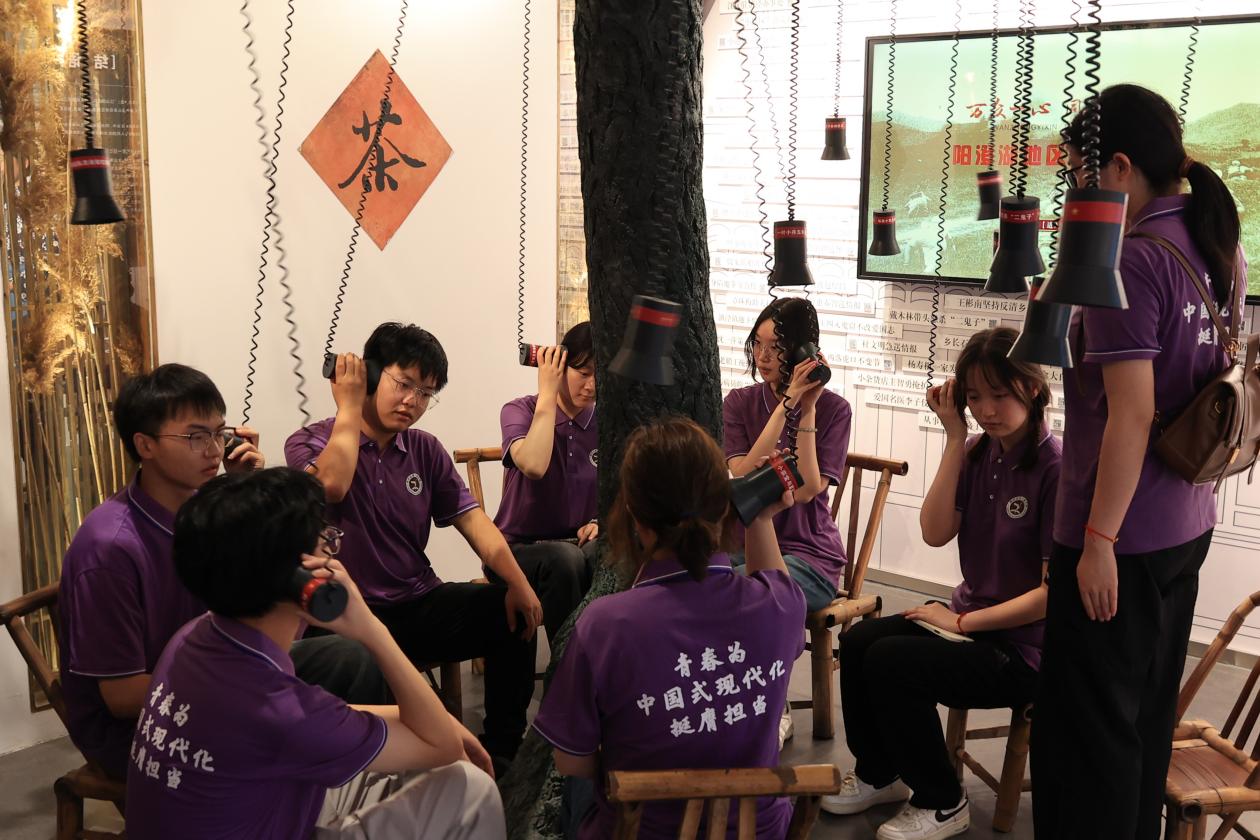 (图为6月29日,“探寻运河文脉,赓续红色基因”团队成员共同观看新四军“江抗”部队的发展史与战斗史。孙涵供图) |