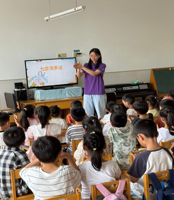 (图为6月27日,“化爱为盾防疾病,药伴暑期守健康”团队许婧媛为孩子们讲解七步洗手法的过程。杨昕文供图) |