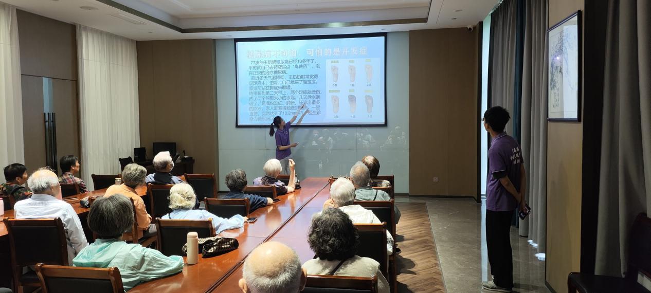 在实践过程中,团队成员中范乐怡深入解析了糖尿病并发症有哪些。在专业知识的基础上,用通俗易懂的语言,向老年人讲解了为什么会出现这些并发症以及其严重后果,重点向大家分享了糖尿病的演变过程,向老年人传递要科学系统地治疗糖尿病的医学理念。