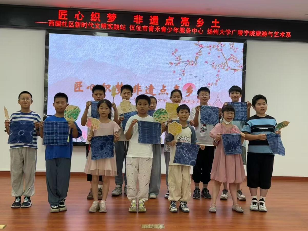 (图为6月29日,“匠心织梦,点亮非遗乡土”实践团队成员与小朋友们手持竹编、扎染作品合影留念。夏瑞谦供图)