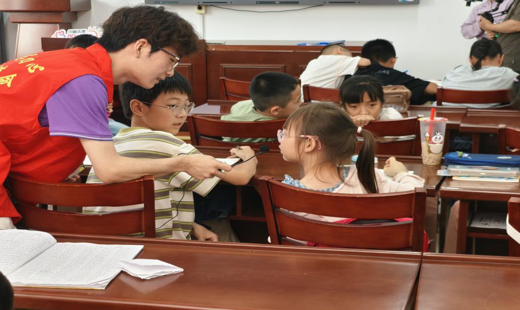 (图为7月1日,“微芒成阳”团队成员甘松林正在向小朋友提问。鸦典供图)