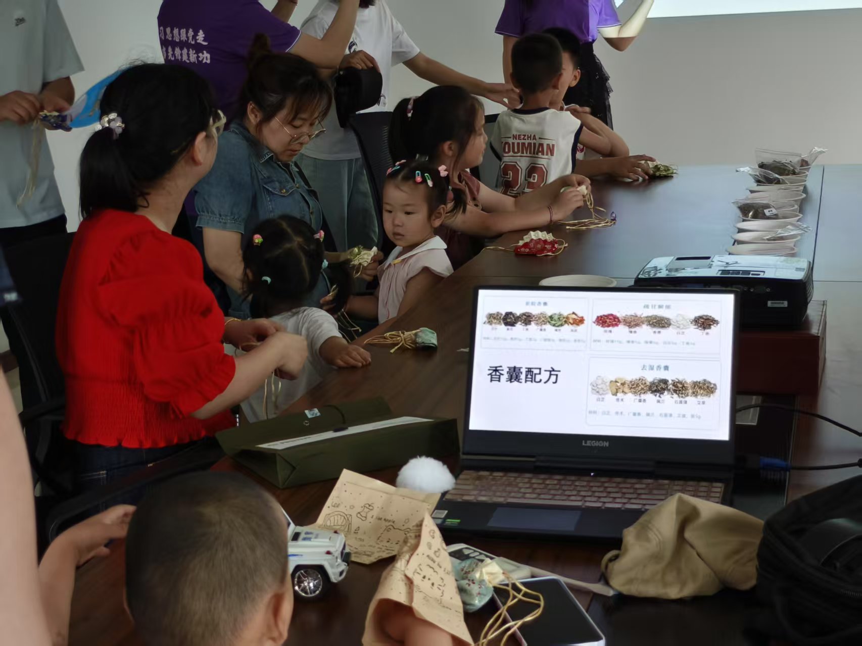 活动还未开始,会议室里就已热闹非凡。实践团队成员们早早抵达现场布置桌椅,将制作香囊所需的艾叶、藿香、丁香、玫瑰花、佛手、苍术、佩兰等各类中药材整齐码放以及色彩鲜艳的香囊袋一应俱全。空气中飘散着淡淡的药香,引得陆续前来的居民们纷纷驻足询问,对活动充满了期待。