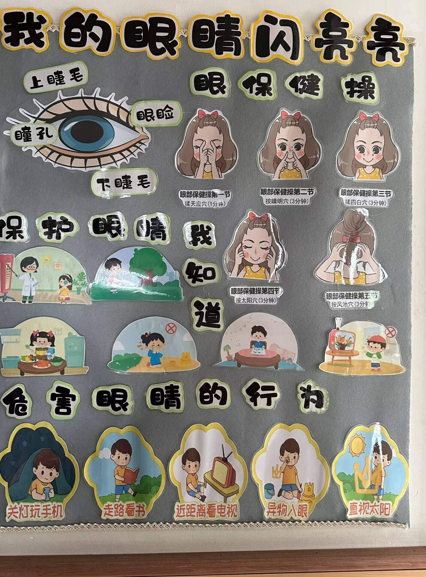 幼儿园的走廊里,醒目的眼保健操宣传板格外吸眼,团队用鲜艳的色彩,简洁的图标,将每个穴位和动作分解呈现,团队成员们手把手示范,带领孩子们找准睛明穴,四白穴,在悠扬的音乐声中,萌娃们有模有样地做起眼保健操,明亮的眼睛里闪烁着求知的光芒。