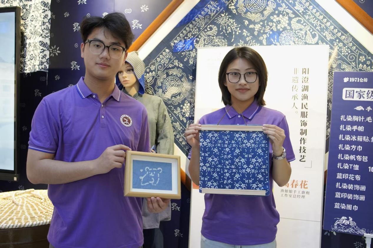 (图为7月4日,“探寻运河文脉,赓续红色基因”团队成员展示亲手制作的蓝印花作品。付艺恒供图。)