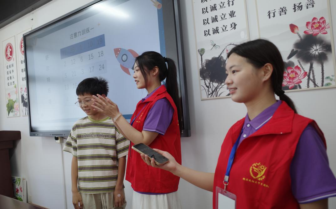 (图为7月1日,“微芒成阳”团队成员梁馨予和小朋友进行注意力训练。李幸妍供图)