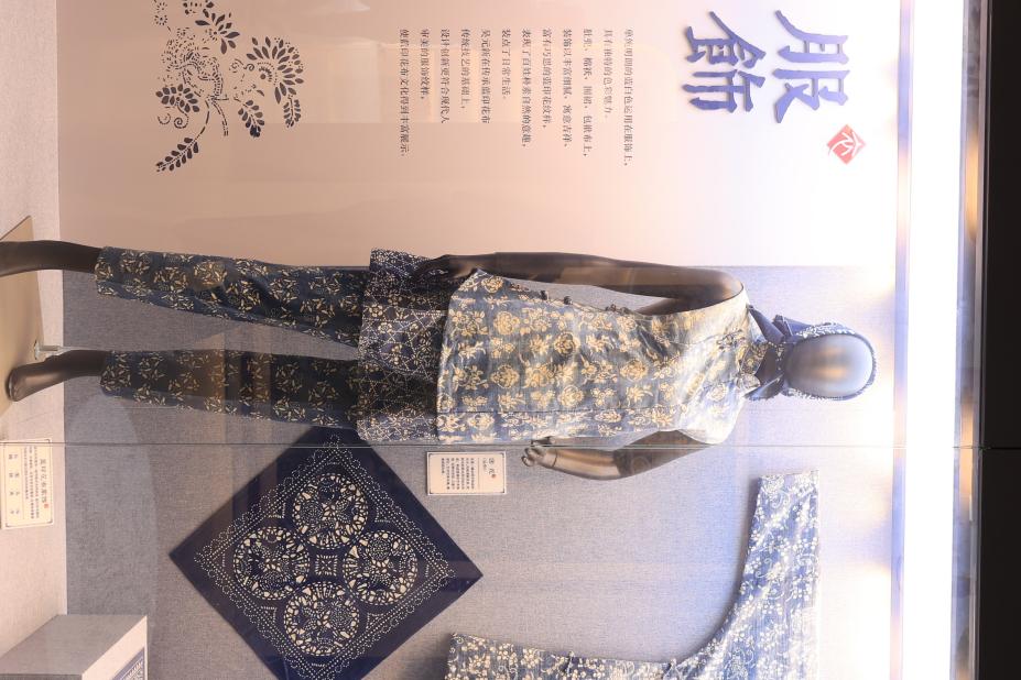 艺术馆展区内,蓝印花的家居用物、服装饰品等整齐排放,每一件都是独一无二的艺术品。在工作人员引导下,团队成员沉浸式感悟传统手工艺品里岁月沉淀的匠心;近距离观赏时仿佛跨越时空,真切体会到古人对美好生活的期许。