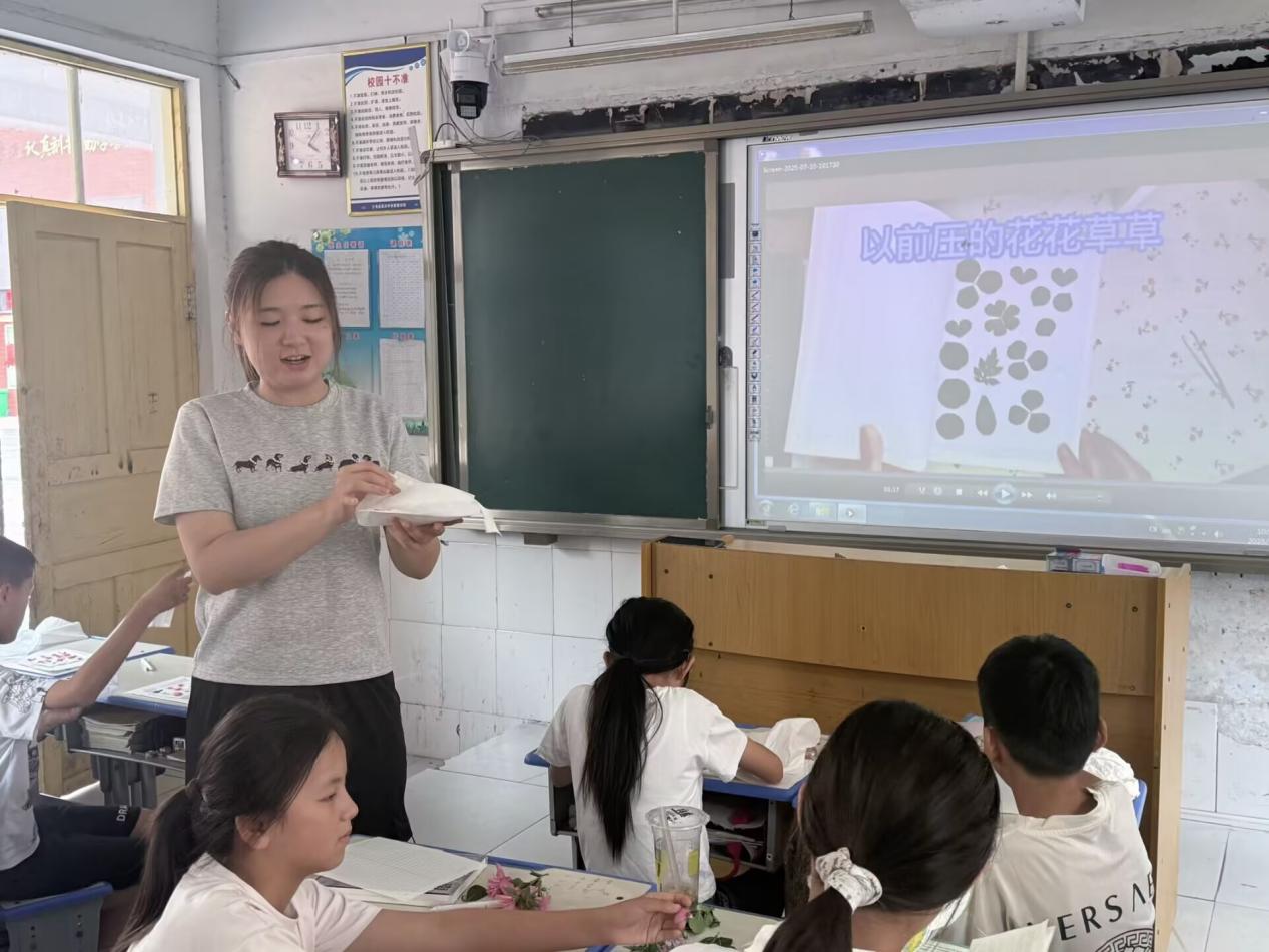 在七年级兴趣课上,团队成员王益茗带领学生们观看压花视频,将收集的花草植物除杂、整理并放入纸张压匀,完整保存后制作成形态各异的书签和装饰品,既美观又实用。
