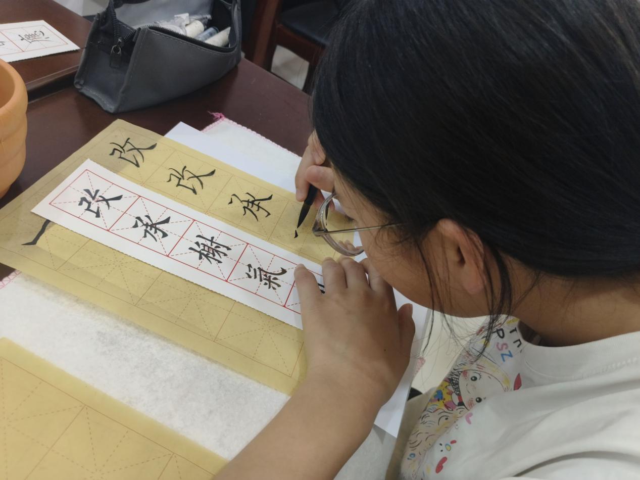 实践环节中,学生们拿起毛笔,在石瑜的指导下练习握笔姿势和基本笔画。学生们从横平竖直的楷书入门,感受笔尖在宣纸上的游走变化,虽然字迹稚嫩,但每一笔都饱含着对书法技艺的好奇与认真。