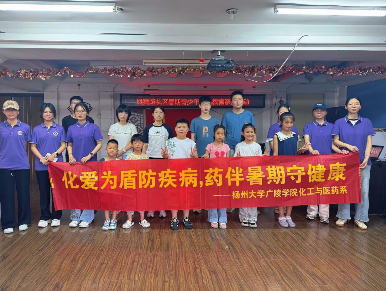 (图为7月21日,“化爱为盾防疾病,药伴暑期守健康”三下乡团队成员们与社区孩子们的合照。王昕文供图)