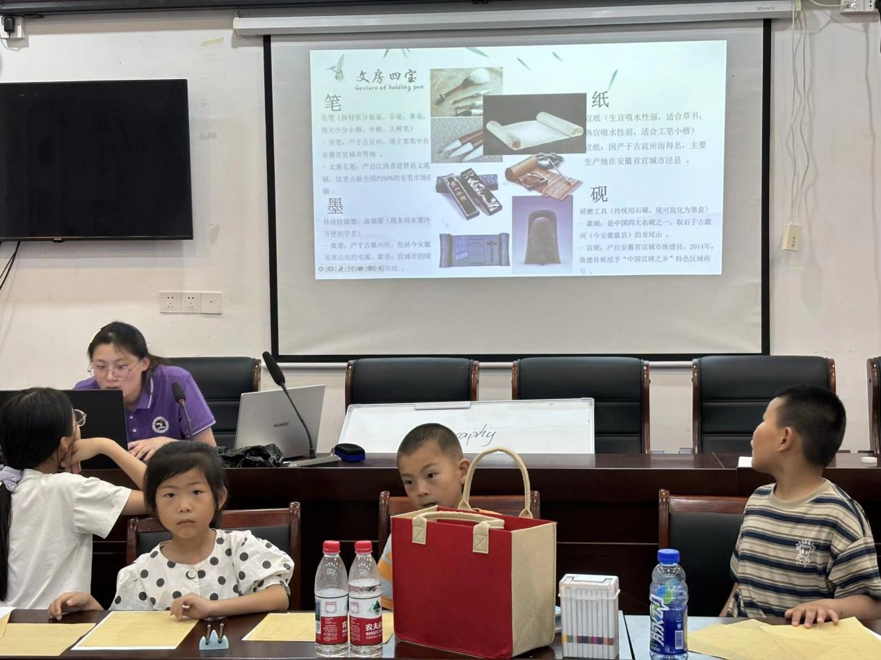 石瑜重点介绍了书法的“文房四宝”:毛笔有狼毫、羊毫之分,决定线条刚柔;徽墨的松烟、油烟能晕染出丰富层次;宣纸分生熟两种,适配不同书体;歙砚则是研磨的得力工具。学生们好奇地观察着毛笔的笔尖、宣纸的纹理,对传统文具充满兴趣。