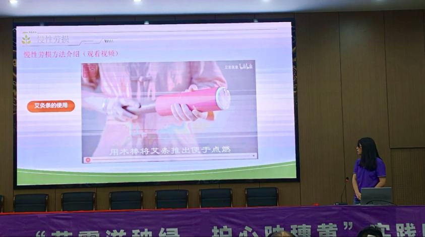 (图为7月17日,"药露滋秧绿 护心映穗黄"团队成员王玥介绍慢性劳损方法。熊梓彤供图)