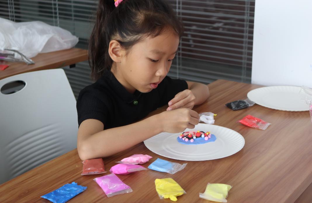黏土创作环节中,大家有序领取黏土材料,瞬间化身“非遗小工匠”,在桌上铺开创意天地。创作过程里,交流声、欢笑声交织:“我做的脸谱是正义大侠,用蓝色代表勇敢!”“我要给孙悟空的脸谱加上金色纹路,更显神通!” 孩子们揉、捏、贴、塑,将对传统戏曲文化的好奇与热爱,都融入手中的黏土。