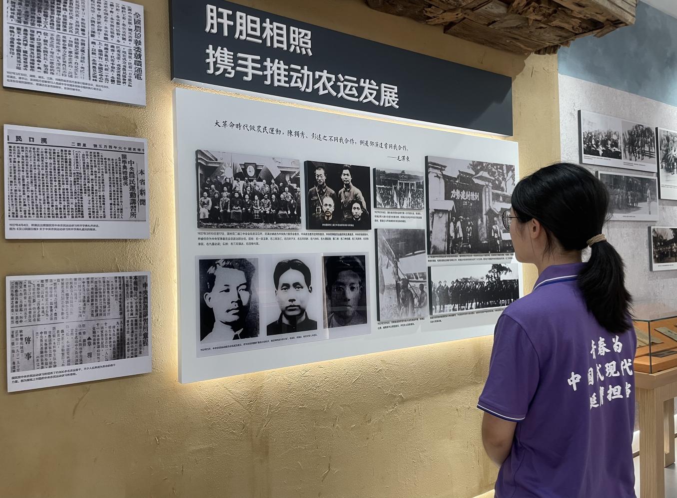 步入纪念馆,欧阳鑫怡循着展厅路线依次参观。沿途展柜里摆着邓演达先生的手稿、当年的文献复印件,及许多珍贵照片。在“农运发展”展区,讲解员细致讲述了邓演达先生在湖北开展农民运动的具体历程,还生动补充了展板未呈现的细节。