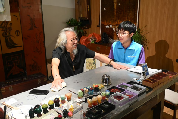(图为8月24日,“广陵匠心传薪火,非遗锦绣续华章”团队成员与金桂清大师交谈过程。)