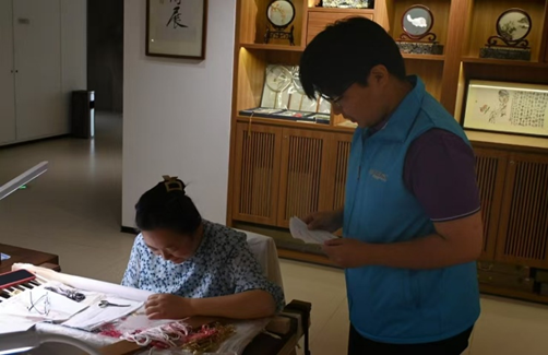(图为8月24日,“广陵匠心传薪火,非遗锦绣续华章”团队成员观看学习苏绣过程。王雪靖供图)