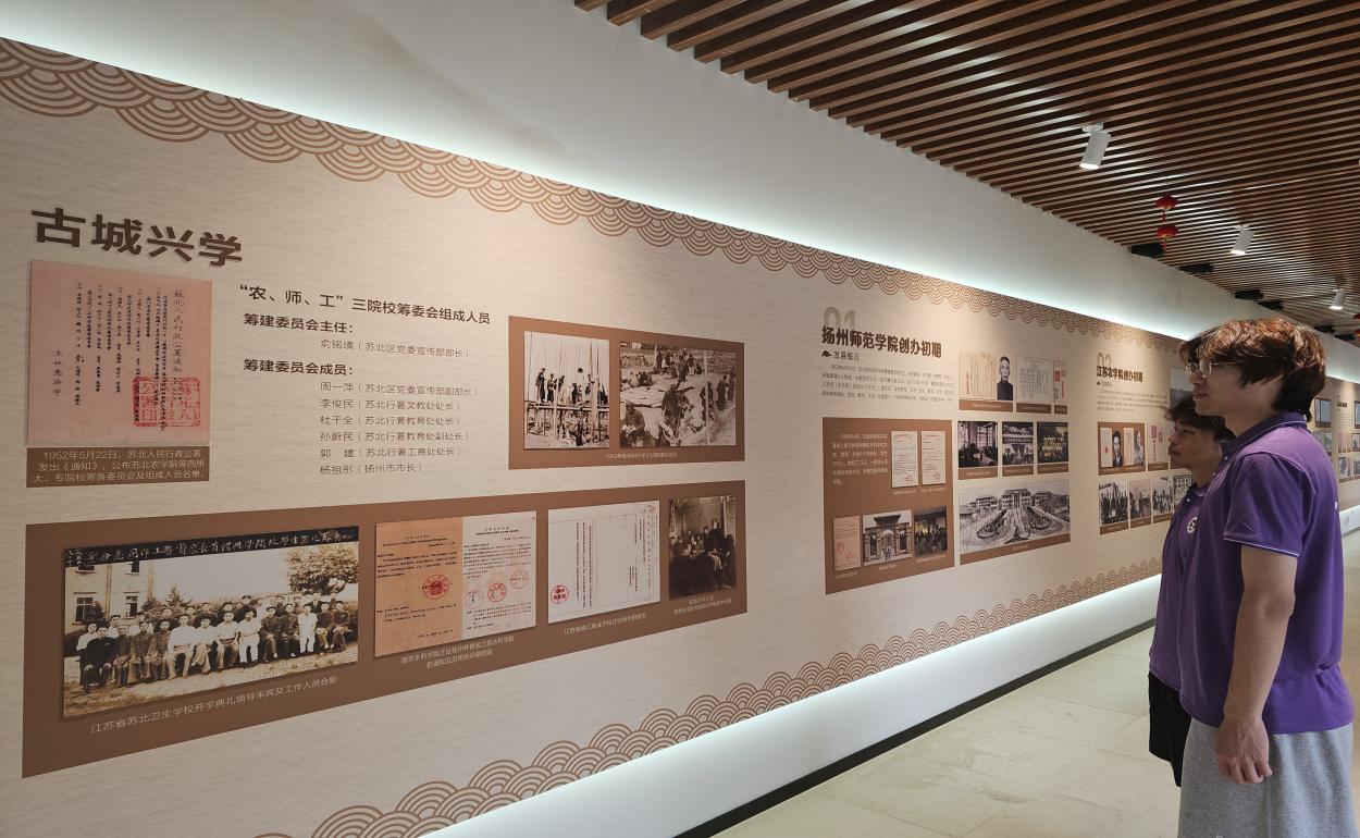 团队成员缓步踏入扬州大学校史馆的厅堂,一段跨越百廿风云的壮阔史诗在他们面前徐徐展开。沿着精心设计的画卷长廊式导览前行,指尖仿佛能触摸到时光的纹理。一幅幅泛黄的照片、一页页珍贵的文献、一件件承载记忆的实物,无声地诉说着这所学府从清末民初张謇先生筚路蓝缕、开创通州师范学堂为肇始,历经烽火硝烟、院系调整,直至今日发展为综合性大学的峥嵘历程。每一步前行,都是对扬大血脉根源的深情追溯。