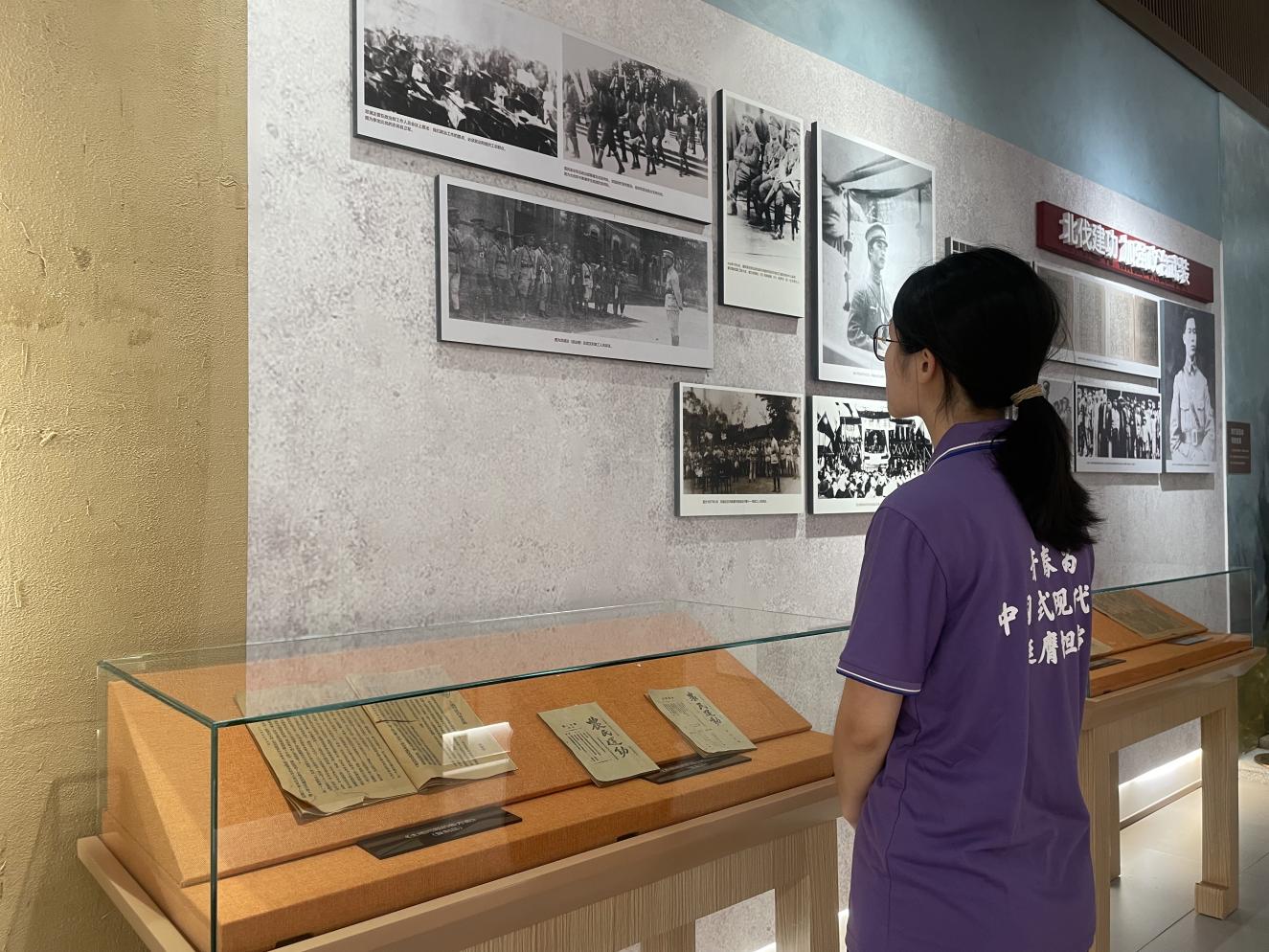 (图为7月9日,“红色薪火传承”实践团团队成员欧阳鑫怡正在认真浏览北伐战争图片。工作人员摄)
