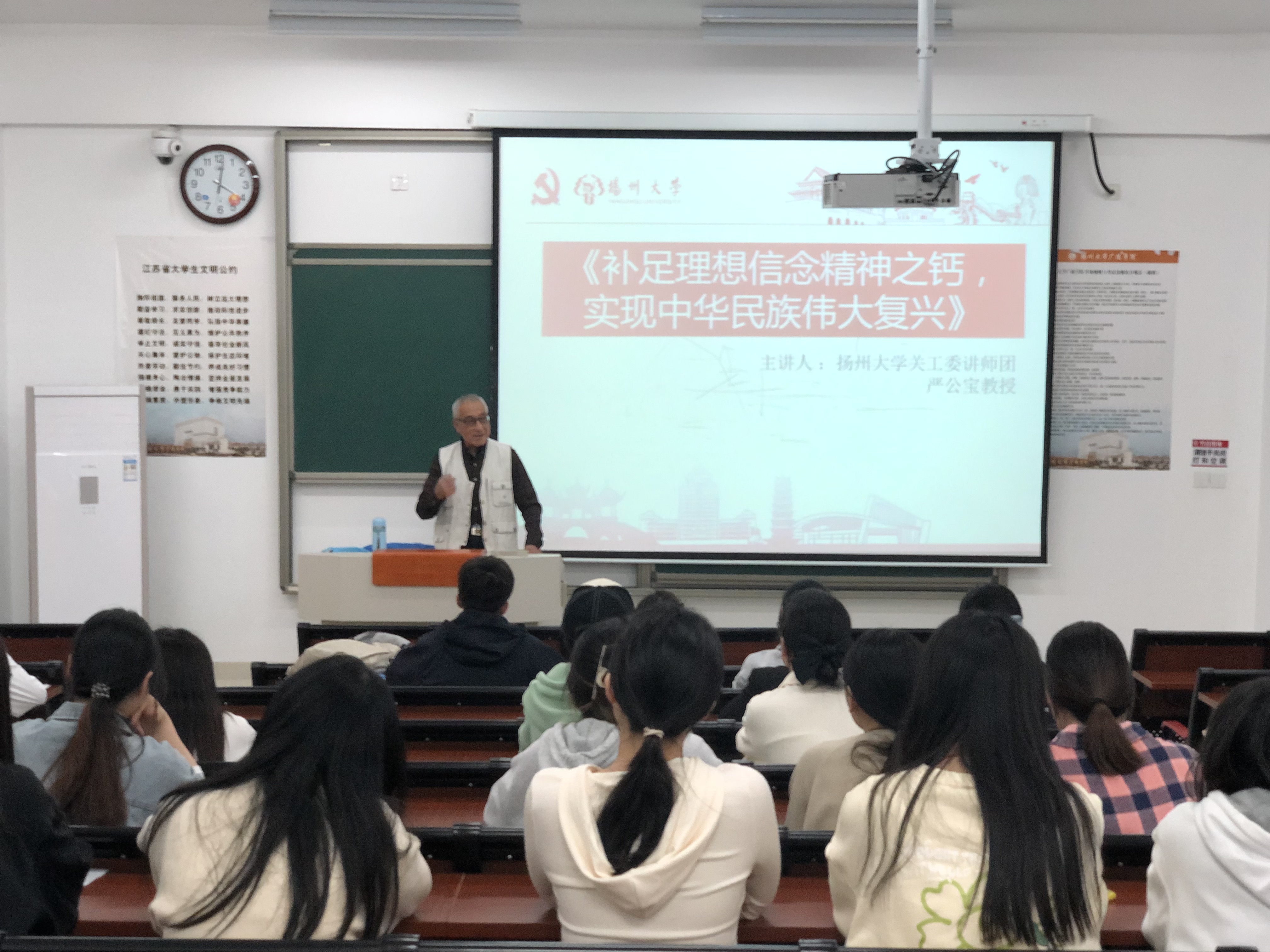 为了帮助同学们坚定理想信念,端正入党动机。广陵学院经管系于5月10日下午16:00-18:00在教学楼W104开展了《补足理想信念精神之钙,实现中华民族伟大复兴》关工委讲座。本次讲座特邀请了扬州大学关工委严公宝教授为同学们进行授课。