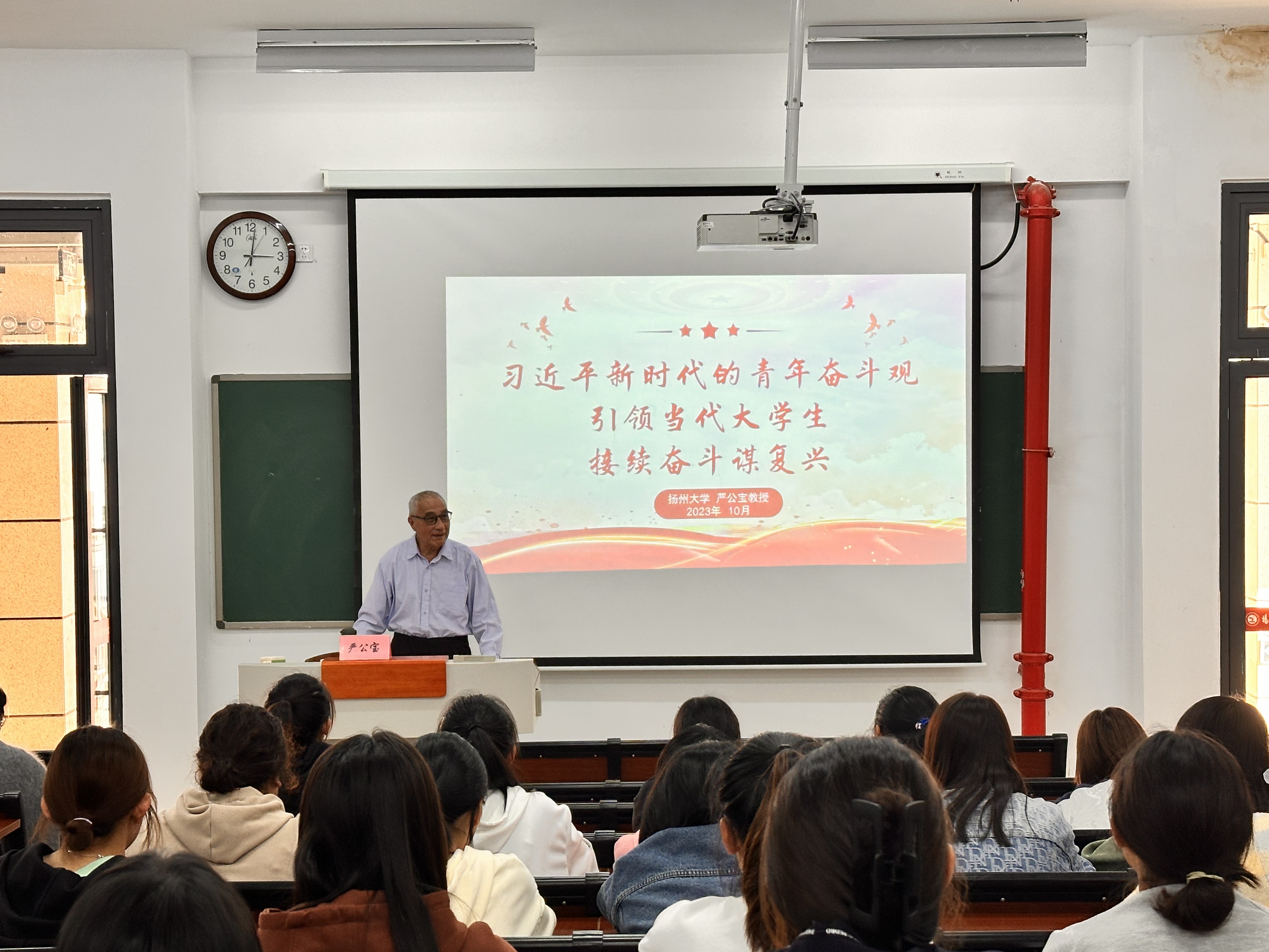 为更好的贯彻落实党的二十大精神和习近平总书记系列重要讲话精神,加强广大青年对习近平同志青年奋斗观的理解,广陵学院文法系于10月11日在教学楼W404开展 “悟奋斗之魂,育强国新人”主题讲座。讲座邀请到江苏省马克思主义研究学会副主席、扬州大学讲师团成员严公宝教授, 2023届辅导员胡静老师主持活动。