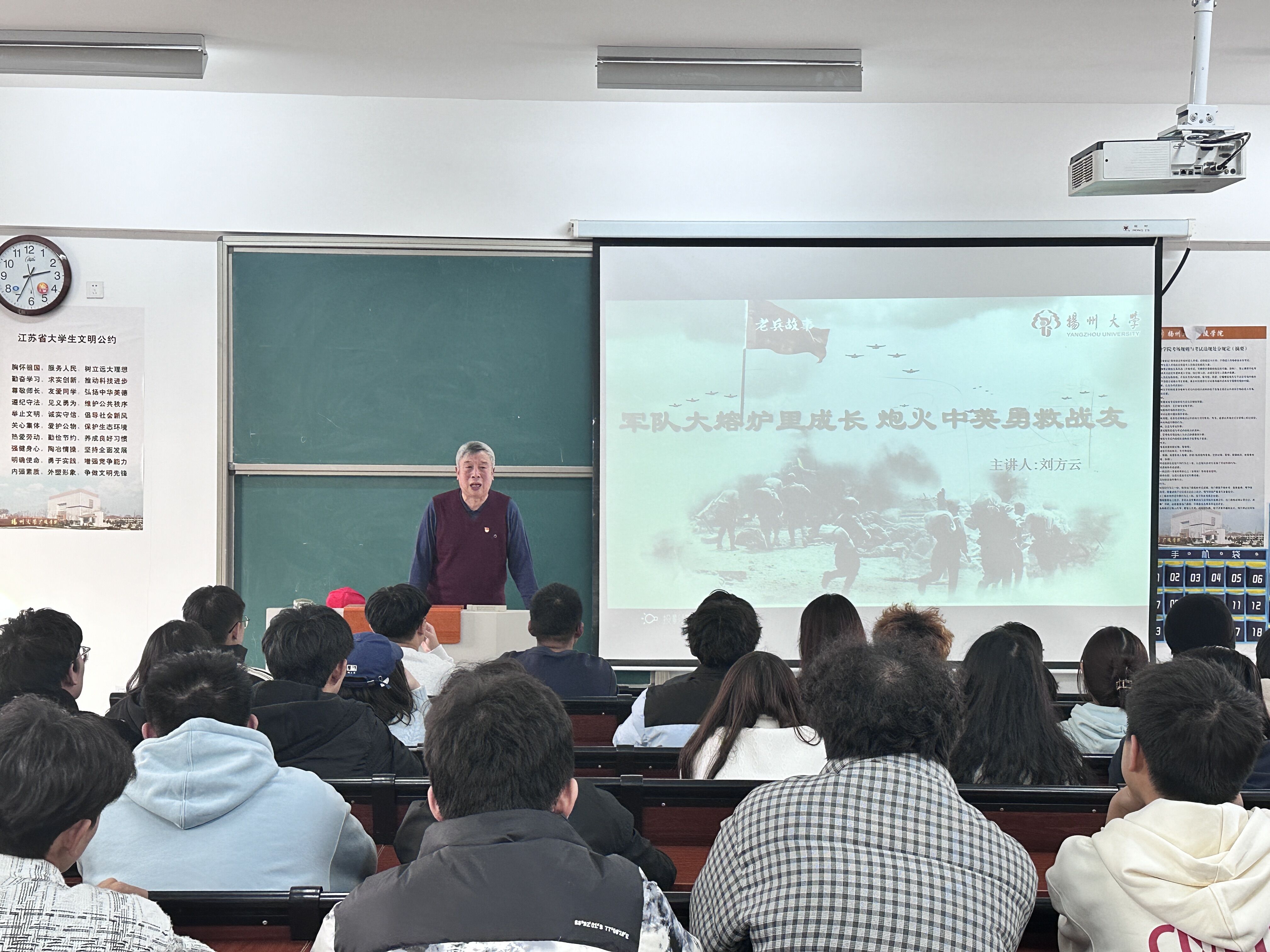 讲座伊始,由机电系辅导员吴俊涵老师为同学们介绍刘方云老师。在讲座中,刘方云老师将自己的精彩人生娓娓道来。潦倒坎坷的幼年经历使他坚定了“人穷志不穷”的信念,而母亲的关怀、党的指导则引领他向美好光明的未来进发。奋不顾身带队救火,在部队中义务服务,援越抗美战场上勇救战友……他以自身经历为例,将革命先辈的无私无畏体现得淋漓尽致。然后,刘方云老师讲述了退役后发生的暖心故事。刘老师在退役后不忘初心,继续为党和国家发光发热。他致力于关心下一代工作,在关工委职位上,开展百余场红色宣讲,用质朴有力的语言告诫同学们要坚持党的领导,坚定理想信念,为实现中华民族伟大复兴的中国梦不懈奋斗。最后,刘方云老师对青年学子提出希望:“希望所有同学不要忘记艰难的战争岁月,努力学习,切莫蹉跎光阴,成为一个意志坚强、懂感恩、不忘本、不怕苦、不怕穷、积极阳光向上的青年学子。”他还寄语同学们要不忘初心跟党走,以共产党员的标准来要求自己。刘老师的精彩发言和爱国热情感染了在座的每一位同学,现场掌声雷动。