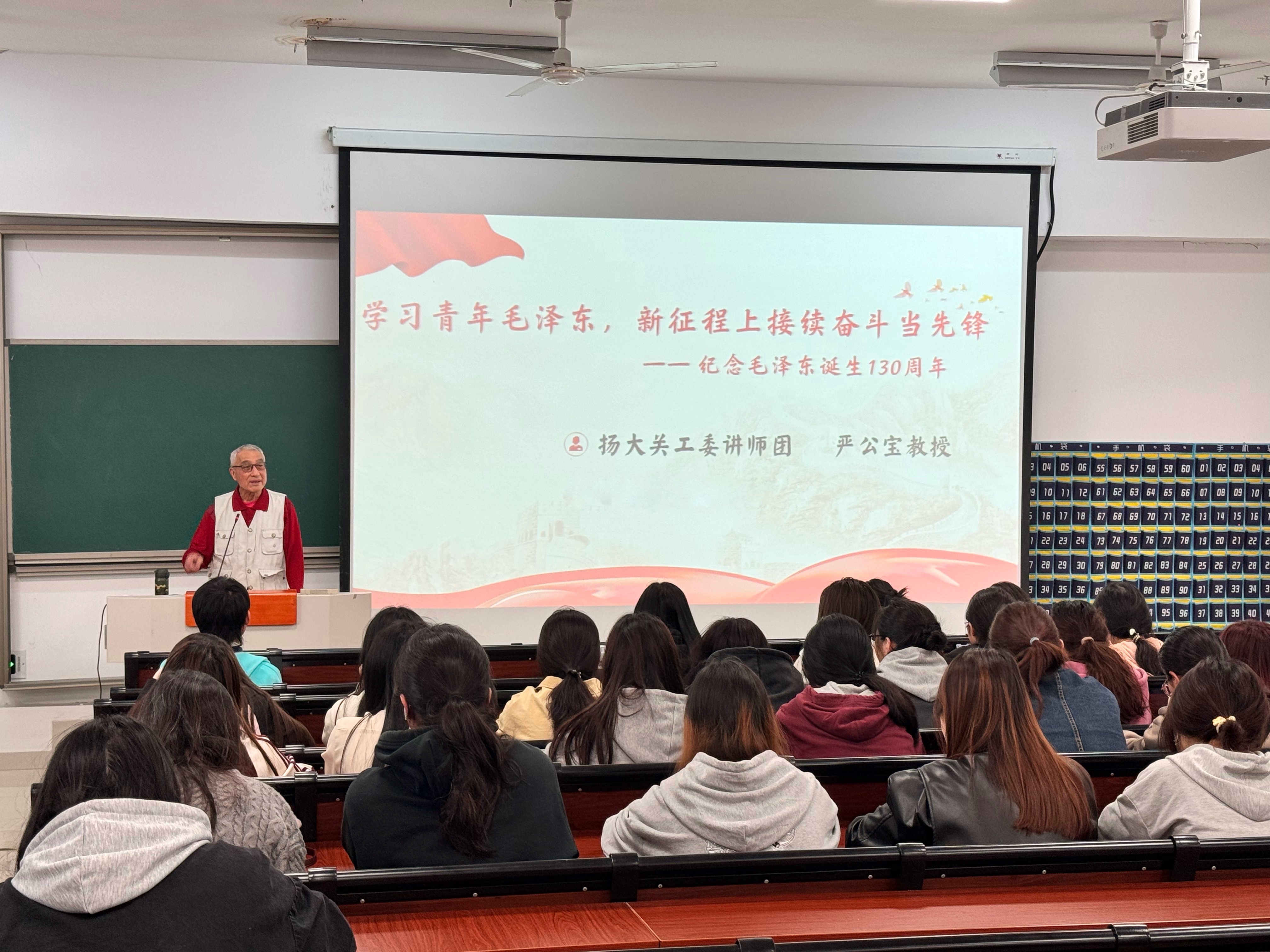 为纪念毛泽东同志、学习毛泽东思想、赓续红色血脉,教育引导青年学生志存高远,激发青年学生的爱国热情与民族自豪感,争做中国特色社会主义事业的合格建设者和可靠接班人,4月17日下午2:00,广陵学院旅游与艺术系在教学楼W401顺利举办《学习青年毛泽东,新征程上接续奋斗当先锋》主题关工委讲座。讲座由扬州大学关工委讲师团严公宝教授主讲。