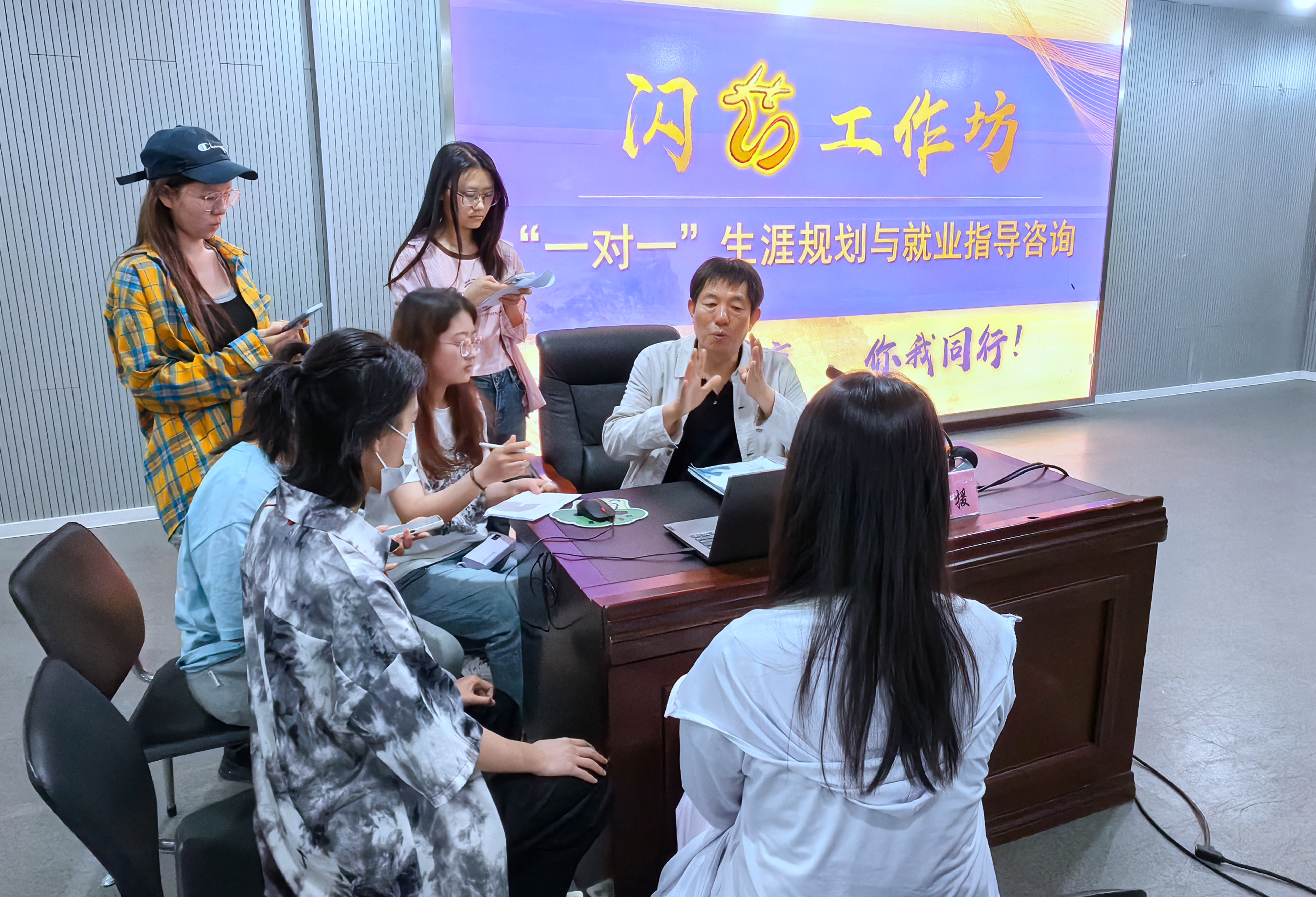在随后的“一对一”职业生涯规划与就业指导环节中,同学们围坐在马援老师身边,马援老师就大家现阶段普遍存在的职业目标不明确以及理论强实践弱、职业能力不能适应和满足企业发展转型需求、职业规划意识和规划能力不强等问题给出了意见和建议。同时,他对即将面临就业求职的大三学生代表如何提高就业能力和竞争力进行了细致解读和深入分析,并精心指导其修改完善个人简历、强调面试技巧,精准帮助其在求职中脱颖而出,为同学们上了一堂针对性和指导性强、生动有趣、内涵丰富的就业指导课和“职场第一课”。