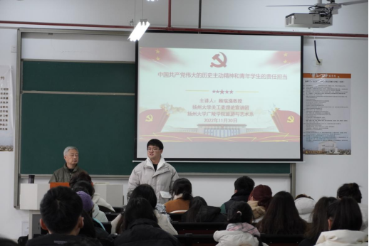 11月30日下午,广陵学院旅艺系于教学楼E405举办主题为“中国共产党伟大的历史主动精神和青年学生的责任担当”的关工委讲座。扬州大学关工委理论宣讲团顾瑞漒教授为此次讲座主讲人,讲座由系辅导员吴杰老师主持,系全体在校学生党员、入党积极分子、各班级主要学生干部参加此次讲座。