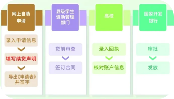 (2)在前往县级学生资助管理部门办理续贷手续前,请先登录学生在线系统更新个人及共同借款人相关信息,再提出续贷申请。按照系统提示填写续贷声明后,打印《申请表》并签字。
