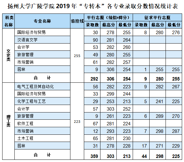 2017~2019年“专转本”各专业录取分数情况统计